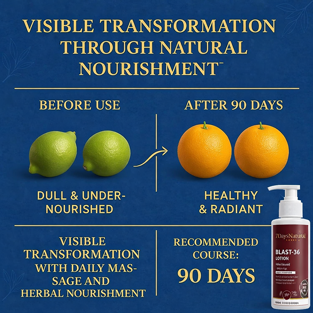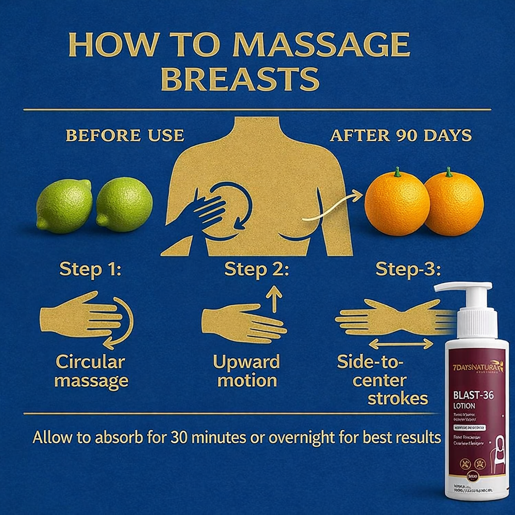 BLAST-36 Lotion by 7DaysNatural is an ayurvedic plant-based formula designed to firm, tighten, tone and moisturize the bust area. Lightweight, fast-absorbing and free from harsh chemicals, it helps improve skin hydration and reduce sagging naturally.